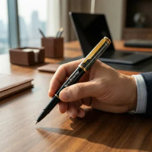 Experience elegance with our Bisht Design Metal Pen, inspired by traditional Arabic Bisht patterns. Designed with a glossy black finish, gold outline accents, and a Bisht-themed cap and clip, this premium roller pen is perfect for high-end gifting, corporate events, and cultural promotions. The smooth blue roller ink ensures a professional writing experience, while its durable metal body adds weight and luxury. Custom packaging is available for bulk and promotional orders.