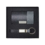 Gift sets GS-3: Business card holder looks great and even more secure that’s why most people with jobs carry them so as not to lose their important cards while digging something out of their pocket. This cardholder is a very neat item with a beautiful leathery cover at the top which makes it more fascinating. This cardholder gift set also carries a leather keychain which completes this gift set. It has a decent contrast of silver and black color.