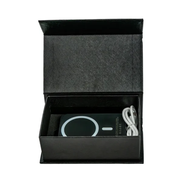 MagSafe-compatible wireless powerbank with 15W fast charging, magnetic wireless function, and illuminated logo branding. A compact and powerful promotional tech accessory packed in a premium magnetic closure gift box.